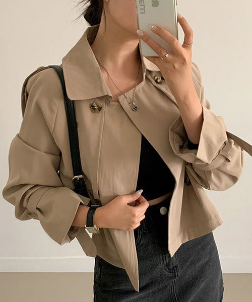 ■ COMMENT トレンチをショート丈に! #春秋に必須 #お手頃価格 ■ SIZE FREE ■ DETAIL - 骨盤上までのセミクロップド丈 - ルーズで自然に体型カバーが可能なフィット感 - トレンチコートに比べてお求めやすい挑戦しやすい価格 : ) ■ FABRIC COTTON 100% - しっかりとした生地感の綿素材で製作 - 程よい厚みで季節の変わり目に着やすいアイテム ■ COORDINATION - ミニスカートと合わせてクロップド丈を活かした脚長コーデ - フレアパンツを履いてトレンチのクラシックさと クロップドのセクシーさが感じられるコーデ ■ NOTICE 大量製造過程による繊維やチョークの印、糸などが混ざる場合がございます。 不良ではございませんので予めご了承ください。