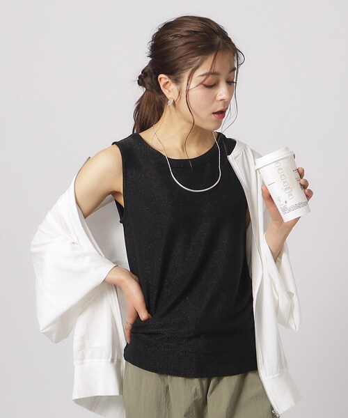 【デザイン】ラメ素材がラグジュアリーな雰囲気のタンクトップ。ゆとりを持たせた首元がデコルテラインをきれいに見せ、大人の魅力を演出する1枚。丁度良いサイズ感が着こなしやすく、大人のきれいめカジュアルスタイルにぴったりです。【スタイリング】シアーアイテムと合わせて大人ヘルシーな着こなしが今年らしいです。カーディガンやシャツをゆるっと羽織、タンクトップをちらっと見せるのもおすすめです。【素材】裏側はさらっと肌触りのよい着心地になっています。※照明の関係により、実際よりも色味が違って見える場合があります。また、パソコン・スマートフォンなどの環境により、若干製品と画像のカラーが異なる場合もございます。モデル情報:身長164cm B78 W56 H80 着用サイズ:02(M)店舗へのお問い合わせ商品番号:741-18344●製品寸法:02(M):着丈56cm B80cm 肩幅30cm03(L):着丈58cm B82cm 肩幅30cm04(LL):着丈60cm B84cm 肩幅32cm備考: