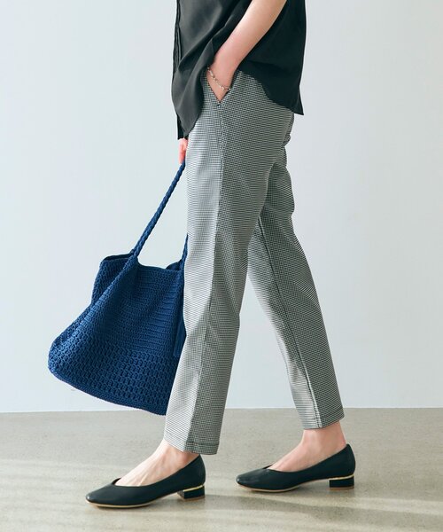 毎年大人気のサマーハイパーストレッチパンツが今年も登場! 【デザイン】 非常に伸縮性の高い、ハイパーストレッチ素材を使用したテーパードパンツ。 特に横方向に伸縮性があり、アクティブに動いても着苦しさを感じない、快適な着用感が魅力の1枚です。 ウエストは素材の伸縮性を活かした、着脱がらくちんな穿きこみデザインに。 前ウエストはギャザーを寄せずに綺麗見えするデザインですが、中にゴムが入っている為生地が伸縮するので、微ストレッチが効いてお腹周りもらくちんです。 素材のストレッチ性を活かして、従来型よりギャザー分量を減らして着用時の後ろ姿がすっきりと見えるよう改良しました。 ウエスト部分はタブとくるみ釦のデザインでアクセントを付けています。 くるみボタンは金縁デザインのタイプをセレクト。 シンプルでスタイリングの邪魔はしませんが、ほんのりと華やかに見えるようにしています。 【素材】 夏に嬉しい接触冷感性と、ストレッチ性を持ち合わせたツイル素材を使用しています。 タテヨコともに伸びる2WAYストレッチ素材です。 細番手の糸をバランスよく織り上げ、真夏にも気持ち良く穿ける適度な厚みを実現しています。 レーヨンナイロン混素材で発色性の良さも特徴。 滑らかな肌当たりも魅力です。 groveで長く愛されている定番素材です。 ♯094カラーは経糸と緯糸で色差をつけたシャンブレーカラーでデニムのような表情。 ♯219は大人っぽく着こなせるマイクロギンガムチェックです。 今シーズンから同素材でワイドパンツ<768-68055>もご用意しています。 ※ポケット数:横×2 ※裏地なし 【スタイリング】 ベーシックなテーパードパンツは着回し力◎。 アクティブに動けるストレッチ性でオフの日にもちろん活躍しますが、素材がキレイめですのでオンシーンにも活躍します。 オーバーサイズのシャツをばさっと羽織るカジュアルなスタイルから、きれいめブラウスを合わせたスタイルまで幅広いスタイルに◎ チュニックなどロング丈トップスとも相性◎です。 ★同素材、同デザインにて、低身長 モデル情報:身長166cm B80 W59 H86 着用サイズ:02(M) 店舗へのお問い合わせ商品番号:768-68056 ●製品寸法: 00(SS):W62~82cm H91cm 股下63cm 前股上29cm わたり幅27 01(S):W65~85cm H94cm 股下64cm 前股上29cm わたり幅28 02(M):W68~88cm H97cm 股下65cm 前股上30cm わたり幅29cm 03(L):W71~91cm H100cm 股下66cm 前股上30cm わたり幅30cm 04(LL):W74~94cm H103cm 股下67cm 前股上30cm わたり幅31cm 05(3L):W77~97cm H106cm 股下67cm 前股上30cm わたり幅32cm 備考: