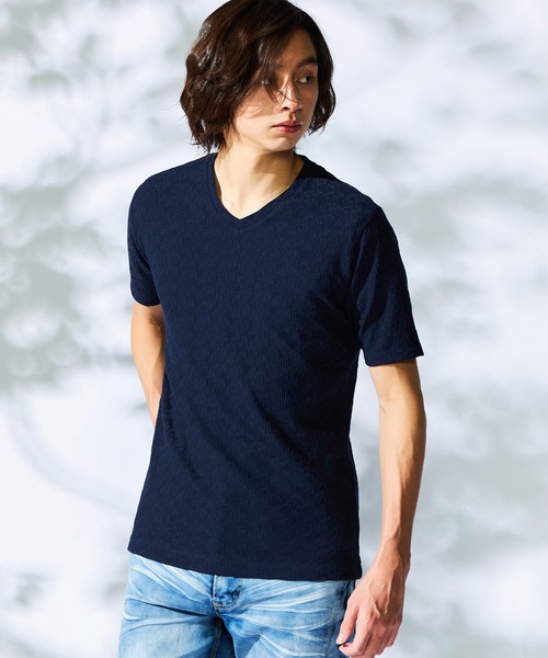 ■デザインオリジナル幾何学柄ジャカード生地を使用した浅めのVネックプルオーバーになります。■サイズややゆったりめのサイズ感で着心地抜群。ウエストにやや絞りを入れたシャープなシルエットも魅力です。■素材独特な表面感のある幾何学柄風リンクスジャカードのオリジナル柄の生地になります。綿とポリエステルを交編する事により物性の安定感と軽さを出しています。ソリッドな印象の地柄ジャカード生地で、シルケット風な加工により上品な光沢と張り感を持たせ高級感のある生地に仕上げています。伸縮性:あり生地の厚さ:普通
