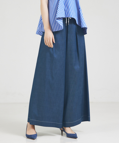 *Detail*ラフな着心地ながら大人顔に纏めてくれるパンツ。 夏らしいカジュアル感を出すために、白いドロスト紐と配色ステッチをポイントにしたデザイン。 ワイドながらウエストにタックを入れ、広がり過ぎないよう仕上げました。 全ゴム仕様でストレスフリーな穿き心地が魅力的。手洗い可能なのも嬉しいポイント。 *Coordinate* 夏に大活躍すること間違いなしのアイテム。 シャツを合わせてラフ過ぎず、大人っぽいスタイリングがおすすめ。 同素材のトップス(NO.32480010013)とのセットアップも◎ ブルー モデル:H170 B77 W58 H85 着用サイズ:38 ブラック モデル:H170 B77 W58 H85 着用サイズ:38 ・洗濯:手洗い可