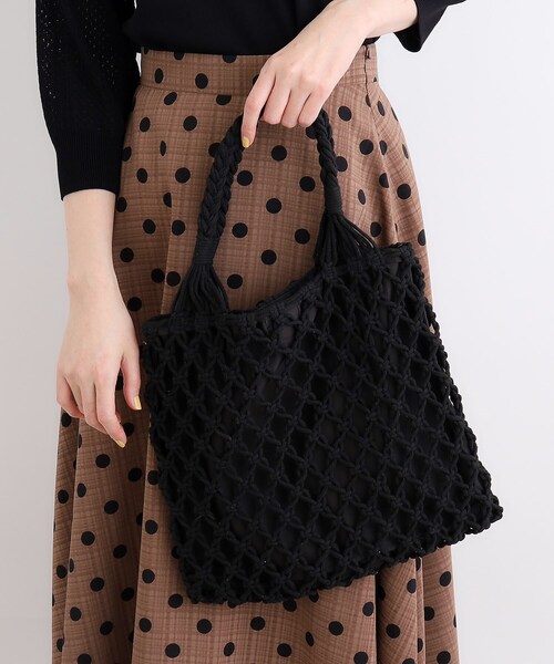 今年トレンド!クラフトテクニックのマクラメ編みトートバッグ 【デザイン】 オリジナルカラーのマクラメ編みです。 肩から掛けられるハンドルになっています。 裏地がついているので中の荷物も気にせず荷物の収納ができるのが嬉しいポイントです。 口元はマグネット付きです。 ※ポケット数:内側×1 ※照明の関係により、実際よりも色味が違って見える場合があります。また、パソコン・スマートフォンなどの環境により、若干製品と画像のカラーが異なる場合もございます。 【24SS】 店舗へのお問い合わせ商品番号:769-08038 ●製品寸法: 00:高さ28cm 幅(上部)30cm 幅(下部)35cm マチ2cm 持ち手上がり20cm 備考:重量:約250g(サンプル重量)