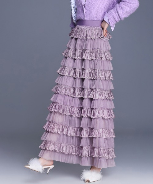 フリルチュールロングスカート シルエットが綺麗なフリルチュールスカート♪ 1枚で一気にコーデが華やかになる優れもの☆中の裏地が短めなので、足首が少し透けて見えるのもポイント。 エレガントなトップスと合わせてがっつりガーリーに着るのも、 ラフなTシャツやパーカー合わせてカジュアルめに着るのも◎ 普段のお出かけやショッピングにも重宝します。 …………………… 透け感:あり 厚さ:ふつう 伸縮性:なし 裏地: あり(ひざまで) ポケット:なし 洗濯方法:お手洗い可/洗濯機可 …………………… ★お買いものをよりお楽しみいただく為に!★ ◆商品のお気に入り登録 お気に入りアイテムの完売カラーの再入荷通知や、ラスト1点の通知、セールの通知も受け取ることができます。 ◆ブランドのお気に入り登録 新商品や再入荷など、クーポン配布などのお得な情報を受け取ることができます。 ※商品画像は撮影時の光や角度により、実物の色味と異なって見える場合がございます。 ※撮影はサンプル品を使用しており、表示のサイズ感も実物とは若干異なる場合もございますので、予めご了承ください。 ※生産時期により色・素材・サイズ感など多少異なる場合がございます。予めご了承ください。