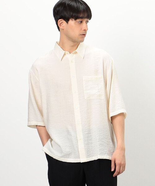 『「楊柳(ようりゅう)」自然なシワ。情緒ある素材。軽く、肌離れの良いサラッとした風合いのショートポイントシャツ。』《素材》楊柳の織り組織による自然なシワ感が特徴の素材です。楊柳(ようりゅう)とは、縦方向に細かいシワ(シボ)の入った薄手の生地です。生地に凹凸があることで肌離れの良いサラッとした風合いです。清涼感があり夏におすすめの生地です。《デザイン》リラックスシルエットのショートポイントシャツです。袖は半袖より少し長めの5分丈にしていますので、夏から初秋まで長期間お使いいただけます。裾はスクエアデザインにしてスリットを入れ、とても動きやすいデザインにしています。単品での着用はもちろん、同素材で展開している47-55PG19(セットアップパンツ※c/#05ブラックのみの展開)とのスタイリングもおすすめです。《取り扱い注意》手洗いもしくは、石油系ドライクリーニング。楊柳は素材の特性上、水洗いや雨に濡れますと、強く収縮します。収縮した場合は、低温アイロンで軽く当てて伸ばして下さい。また強く押し過ぎると伸び過ぎますので御注意下さい。家庭で手洗いする場合は、水又は30℃以下のぬるま湯で揉まずに軽い押し洗いをして下さい。……………………透け感:生成あり、黒ややあり厚さ:やや薄手伸縮性:なし光沢感:なし裏地:なし洗濯方法:手洗い、ドライクリーニング……………………※画像の商品はサンプルとなりますので実際の商品と仕様、加工、サイズが若干異なる場合がございます。※こちらの商品はFIVE FOXes独自の採寸方法となっています。本サイトのサイズガイドと採寸方法が異なる場合がありますのでご了承ください。