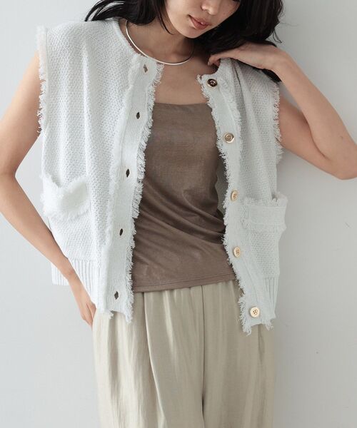 Design Point旬なツイードをカジュアルにニットで仕上げた、さっと羽織るだけで華やかさをプラスしてくれるジレ。少し肩をおとした適度にゆとりがあるシルエット、メタリックな釦使いなど、こなれ感と洗練された印象に仕上げました。きちんと見えつつ、カジュアル感のあるアイテムです。Styling PointTシャツの上に羽織ったり、リブニットなどぴったりインナーの上に羽織ってもGOOD。釦を留めて一枚ですっきりと着こなすのも◎デニムとコーディネートしてカジュアル感をプラスするのがおすすめですが、きれいめボトムでこなして上品に着こなすのも。カジュアルから通勤シーンまで、着回しを楽しめる一枚です。モデル情報:身長170cm B82 W60 H89 着用サイズ:38(M)店舗へのお問い合わせ商品番号:523-48402●製品寸法:38(M):着丈54cm B104cm 肩幅40cm アームホール26cm備考:重量:サンプルサイズ約320g