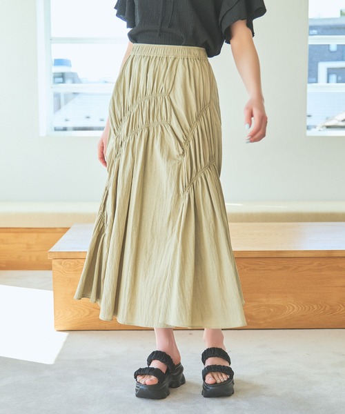 ーーーランダムに絞られたシャーリングがデザイン性高く華やかなスカートーーー■point・ランダムなシャーリングデザインが1枚で華やかなコーディネートに仕上げてくれる・程よいハリ感で体のシルエットを拾いにくい♪・伸縮性があり楽ちんな履き心地◎・細見えが叶う微マーメイドシルエット・ウエストは総ゴムでストレスフリーで着用できます■styling微マーメイドシルエットなためオーバーサイズのトップスとも相性◎足元は、ヒールはもちろん厚底サンダルと合わせたスポーティなコーディネートも楽しめます。※屋外の光や照明の当たり具合で、実際の商品の色味とカラー別画像の色味に若干の違いが発生する場合がございます。 詳細画像と併せてご確認の上、ご注文いただきますようお願い致します。【INFORMATION】■商品のお気に入り登録完売していても再入荷時に再入荷通知を受け取ることができますので、是非ご登録ください!■ブランドのお気に入り登録新商品や再入荷などの情報を受け取ることができますので、是非ご登録ください!