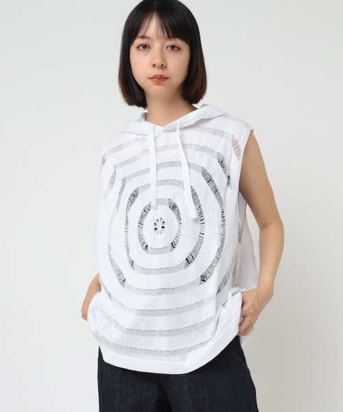 渦巻き柄のノースリーフーディー 透かし編みを使用した柄の、他にはないノースリーブです。 編み地やサイズ感にこだわり、暖かい時期にも着ることができます。 ▼シリーズアイテム K2675 メッシュフットボールT フードはボディとは別のデザインの透かし編みで仕上げました。 1枚で着たり、Tシャツとのレイヤードもおすすめ。 Tシャツの上からはもちろん、Tシャツの中に着てフードを出しても、 スタイリングのアクセントになります。 アクセサリー感覚でスタイリングに取り入れることができるアイテムです。 生地感:普通・やわらかい 透け感:透ける 伸縮性:ややあり ※こちらは参考情報となります。多少の誤差はご了承ください。 ---------------------------------------------------------------------- ◆◆お気に入り登録しておすすめ情報をゲットしよう◆◆ 【商品のお気に入り登録】 再入荷、残り1点、セール、タイムセール、クーポンなど、 いち早く受け取ることができます。 【ショップ・ブランドのお気に入り登録】 新商品、予約商品、再入荷、ショップのおすすめトピックスなど、 ショップ・ブランドの最新情報を受け取ることができます。 ---------------------------------------------------------------------- ※画像の商品はサンプルです。 実際の商品と仕様、加工、サイズが若干異なる場合がございます。 ※撮影場所により、光の当たり具合で色味が異なって見える場合がございます。商品の掛け画像をご参照下さい。