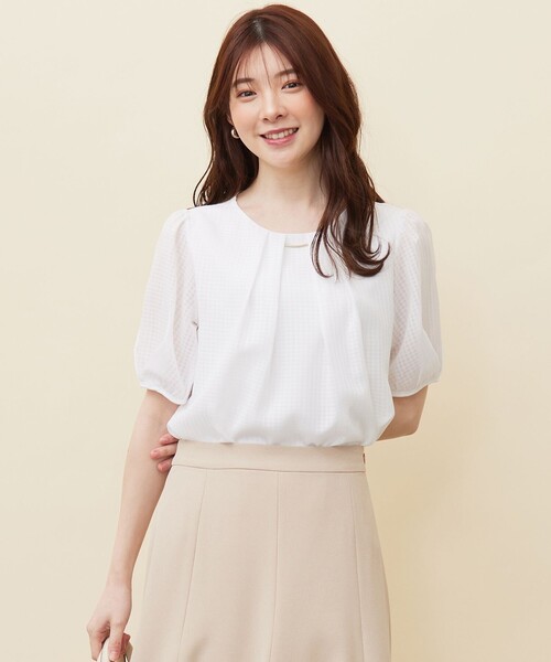 吸水速乾・UVケア・接触冷感など 機能性抜群のコンフォートジャージーシリーズ ブラウス感覚で着こなせる、ブラウス見えのフェミニンカットソー ■デザイン シアー感のあるチェック柄シフォンを使用したブラウス感覚で着こなせるカットソーです。襟元のメタルバーは取り外し可能。ネックレスとスタイリングする場合は取り外す等お好みに合わせて着こなせます。袖は適度なボリューム感のが今っぽい印象に。 ■素材 表はソフトな風合いの綿とレーヨンの混紡糸、裏はポリエステル糸を使用しています。熱伝導率が低いポリエステルを使用しているため、着用時のひんやり感とさらさらとした肌触りが特徴。吸水速乾・接触冷感機能を高める特殊加工をしており、初夏~盛夏まで快適な着心地に仕上げています。更に綿特有の毛羽を抑えるバイオ加工を施しています。 ■コンフォートジャージーシリーズ コンフォートジャージー カットソー(KKWPCM0400) こちらの商品はサイズバリエーションがございます。 Rレギュラーサイズ(KKWPCM0401) S小さいサイズ(KKWQCM0401) L大きいサイズ(KKWKCM0401) ※袖部分は裏地なし仕様のため、透け感がございます。 ※商品画像はサンプルを使用しているため、色味やサイズ等の仕様に変更がある場合がございますので、予めご了承ください。 ※屋外での撮影画像は、光の加減で色味が違って見える場合がございます。商品の色味はスタジオ撮影の画像をご参照ください。 #anySiS #エニシス #エニィシス #レディース #トップス #カットソー #Tシャツ #きれいめ #きれいめコーデ #大人レディ #フェミニン #レディスタイル #カジュアル #きれいめカジュアル #大人可愛い #お出かけコーデ #通勤 #オフィスカジュアル #オフィスコーデ #お仕事 #洗える #ウォッシャブル #接触冷感 #吸水速乾 #UVケア 洗濯表示 【本体のみ】40℃まで弱洗濯可 塩素系漂白不可 タンブル乾燥不可 日陰つり干し乾燥 アイロンは160℃まで ドライクリーニング(石油系)可 弱いウェットクリーニング可