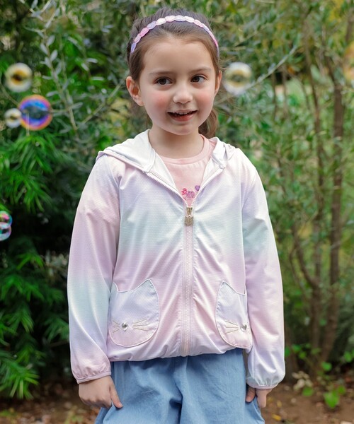 夏にも使える!サラサラUVカットパーカー POINT ●紫外線90%カットのUV加工 ●ネコモチーフのキュートなポケット ●フードはまとめられるので通園・通学にも◎。 ■デザイン 薄手で軽いサラサラパーカー。紫外線を90%カットする、UVカット加工を施しています。ネコモチーフのポケットがキュートなポイント♪ネコのお鼻部分はキラキラのビジューに!フードはトメッCIAOでリボン型にまとめられるので、通園・通学スタイルにも◎。ご家庭の洗濯機で洗えるので汚れても安心。夏のクーラー対策としても使える、万能アイテムです。※レインボーカラー(#682)は一点一点色の出方が異なるため、広げたときに現れる柄は世界で一つだけの配色です。WEB上では柄を選んでいただくことは出来かねます。予めご了承ください。 【裏地】なし【厚さ】普通【透け感】ややあり【伸縮性】あり【ポケット】あり【洗濯機】可能 ◇any FAM KIDS X サスティナブル ◇ 私たちは「お下がり」を応援しています。サイズが小さくなってしまったらお洋服をお譲り出来るよう、3名分のお名前が書けるネームタグ付きです。 ■サイズ こちらの商品は140~160cmのサイズバリエーションがございます。(品番:JKFSCM0430) ※モデル着用画像はサンプルを使用している為、実際にお届けする商品と仕様、加工、サイズが若干異なる場合がございます。予めご了承ください。 ※掲載画像はご利用いただくPCやスマホの画面環境の都合上、実際の商品と色合いが異なって見える場合がございます。 キッズ/長袖/羽織/パーカー/UVカット/ネコ/リボン/ハート/フード/通園/通学/人気/デイリー/女の子/ガール/サスティナブル 洗濯表示 レインボー、オフホワイト、サックスブルー:【本体のみ】 40℃まで弱洗濯可 塩素系漂白不可 タンブル乾燥不可 日陰つり干し乾燥 アイロンは110℃まで、スチーム不可 ドライクリーニング(石油系)可