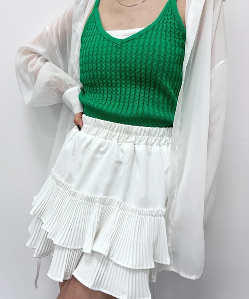 ◆歩くたびに揺れるフリルが目を惹くミニスカートふわりとしたシルエットに、プリーツの豊かな表情をプラス。1枚で動きのあるコーディネートになります。ゴージャスでフェミニンな雰囲気で可愛らしさを演出。広がりを持たせた形で美脚効果を持たせ、すらりとした印象に◎揺れ感がドラマティックでスタイリングを華やかに演出してくれます。ウエストゴム仕様で穿き心地も楽々◎しなやかな落ち感が大人な印象で、デイリー使いしやすい通年生地です。ロングシーズン着ていただけるアイテムです。普段使いはもちろん、デートや女子会など幅広いシーンにも活躍してくれる。トップスをインして着るコーディネートがおすすめですが、オーバーサイズなトップスを合わせてよりカジュアルダウンしたコーディネートも楽しめます。【coordinate】シンプルなカットソーやシャツと合わせるだけでぐっと今年っぽいスタイリングになります。ウエストはゴム使用なので、快適に着用して頂けます。スカートは腰回りがスッキリみえるように、ピッタリしすぎない綺麗なシルエットです。ボリュームのあるニットや柄のニットとの合わせも◎合わせるアイテム次第で雰囲気がガラリと変わります。ワントーンでまとめたコーディネートも。カジュアル/ワッシャー/フレア/プリーツ… SEN TOKYO … 媚びない透け感やさりげない肌見せを強みに、ハンサム×女性らしさを目指したデザイン性高いブランド@sen_tokyo_official---------------------------------------------------【より良いお買い物サービスを】▼商品のお気に入り登録完売カラーの再入荷通知や、ラスト1点の通知、セールの通知も受け取ることができます。▼ブランドのお気に入り登録新商品や再入荷等、いち早くブランドのお得な情報を受け取ることができます。---------------------------------------------------※撮影場所やイメージにより、実際の商品と色味が若干異なる場合がございます。※サイズに若干の個体差が生じる場合がございます。※当商品は機械による生産の過程上、どうしても"生地を織る際の糸の継ぎ目"や多少の"ほつれ"、他繊維の"混紡"、形やサイズや柄に多少の"誤差"が生じる場合がございます。予めご了承下さい。