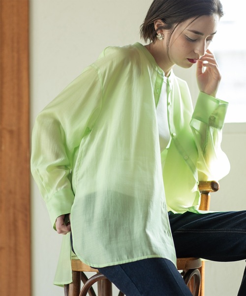《VERY 8月号掲載》これからの季節に大活躍!長めで使いやすい、シアーシャツ【デザイン】・ほどよい透け感が今年らしい、シアー素材のバンドカラーシャツです。・羽織りとしてはもちろん、スタイリングのポイントとしてたすき掛けに巻いても◎。・長めの着丈なので体型カバーにもおすすめです。【素材】・再生繊維(セルロース)とポリエステルを混紡した素材を使用。・やや光沢があり、少しハリのあるシアー感が特徴です。・軽い素材感なので、外出時の持ち運びにも便利。・お手入れが簡単なマシンウォッシャブル素材です。モデル情報:身長166cm B72 W57 H84 着用サイズ:38(M)店舗へのお問い合わせ商品番号:637-88042●製品寸法:36(S):着丈71cm B116cm 袖丈54cm 肩幅52cm38(M):着丈72cm B119cm 袖丈55cm 肩幅53cm40(L):着丈74cm B122cm 袖丈56cm 肩幅54cm42(LL):着丈74cm B125cm 袖丈57cm 肩幅55cm備考: