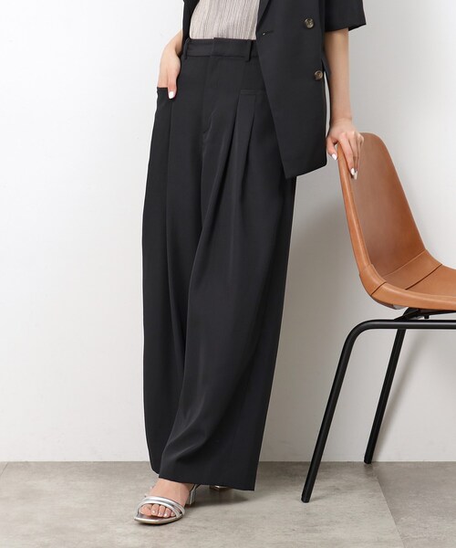 【AMARC×大草直子×OPAQUE.CLIP】クールかつリラクシーなムードで着られる、鮮度の高いタックデザインワイドパンツ。【デザイン】・両サイドのポケットと、深いタックがアクセントのワイドパンツ。・細かなデティールとシルエットで、新鮮さのあるデザインパンツが完成。・腰から裾にかけてまっすぐに、美しいラインを描くストレートワイドシルエット。※ポケット:横×2,後ろ×2※003カラー、019カラーは同素材のジャケット(637-48024)とセットアップでの着用もおすすめです。【素材】・麻を1%ブレンドしたポリエステル素材を使用。・麻のさらりとしたドライな印象はありつつも、ハリがあり、フラットな表情できれいめに着られます。・マシンウォッシャブル、イージーケア機能付きでお手入れも簡単です。※裏地無し※オフホワイト(003)はやや透け感があるため、インナーの着用をおすすめします。 ※40のみWEB限定サイズとなります。※照明の関係により、実際よりも色味が違って見える場合があります。また、パソコン・スマートフォンなどの環境により、若干製品と画像のカラーが異なる場合もございます。 ーーーーーーーーーーーーーーーーーーーーーーーーー【AMARC×大草直子×OPAQUE.CLIP】Say hello to "NEW ME"― 「新しい私」を見つける1枚 ―第7弾となるAMARC大草直子さんとのコラボコレクションが完成しました。ほんの少しモード。ほんの少し華やか。ほんの少し強い。「ほんの少し」が「新しいおしゃれ」へのひと押しになりますように――。モデル情報:身長166cm B72 W57 H84 着用サイズ:38(M)店舗へのお問い合わせ商品番号:637-68032●製品寸法:36(S):W64cm H94cm 股下66cm 前股上33cm 渡り幅33cm 裾幅25cm38(M):W67cm H95cm 股下67cm 前股上34cm 渡り幅34cm 裾幅27cm40(L):W70cm H96cm 股下69cm 前股上35cm 渡り幅35cm 裾幅30cm備考: