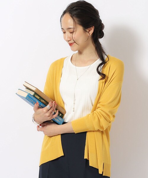 さらっと羽織れる便利アイテム。さらさらとした触り心地のニットカーディガン。 【デザイン】 軽いニット素材で仕立てた着流しタイプのショールカーディガンです。 さらっと羽織れる便利アイテム。 日焼けや冷房対策の持ち運びにも便利です。 【スタイリング】 ベーシックカラーのオフホワイト(003カラー)、ライトグレー(011カラー)、ブラック(019カラー)は、ブラウスやワンピースにさっと羽織ればきれいめなオフィスカジュアルにぴったりです。 目を惹くイエロー(031カラー)やブルー(091カラー)はカジュアルコーデに、ピンク(072カラー)は大人フェミニンコーデにマッチするので、いつものコーデのポイントにおすすめ。 羽織の他にも、肩掛けにすればこなれ感もプラスできます。 シンプルなデザインなので、パンツやスカート、ワンピースなどボトムを選ばず合わせていただけます。 【お客様からいただいたコメント】 ・短い丈のカーディガンなので、冷房がきいた部屋の冷え対策にぴったりです。 (身長:158cm 体型:やせ型 ブラック購入) ・これからの季節、少し肌寒い時にはとても役に立ちます。UVカットも入っているのでとてもお勧め。丈も長すぎず、パンツ、スカートと服を選びません。 (身長:157cm 体型:普通 ライトグレー購入) ・モノトーンやベージュ系に合う色の服を探してて、きれいなブルーのこちらを購入しました。夏はエアコン対策にも使えるし便利そうです。 (身長:161cm 体型:普通 ブルー購入) とのお声を頂戴しております。 【素材】 レーヨンのさらりとしたニット素材。 少しドライタッチで着心地も良いです。 ※マシンウォシャブル可 ※UVカット ※この製品は、太陽光線中の紫外線(UV)を通しにくくします。この効果は永久的ではありません。 モデル情報:身長166cm B81 W57 H86 着用サイズ:00(FREE) 店舗へのお問い合わせ商品番号:741-38100 ●製品寸法: 00(FREE):着丈59cm B112cm 袖丈51cm 肩幅46cm 備考: