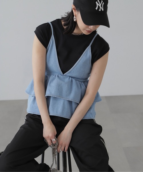 (fabric&desing)レディーライクなシャープなカッティングのブラトップに、ティアードフリルがポイントのキャミブラウスです。バックデザインは、リボンの締め具合で、すっきりとしたシルエットから、ゆるくも合わせられます。ウエスト部分もゴム仕立てなのでラフな雰囲気で着て頂けます。(styling)お好みのカップ付きインナーですっきり合わせや、ロゴTシャツ合わせなどビスチェのようなラフな着こなしもお勧めです。■透け感:なし■生地の厚さ:薄手■裏地:なし■伸縮性:なし■光沢:なし■シルエット:スタンダードmodel:骨格ウェーブ---------------------------------------------------◆商品のお気に入り登録◆お気に入りアイテムの値下げ・再入荷・在庫1点などの通知を受け取ることができます。◆ブランドのお気に入り登録◆新商品や再入荷、セール、クーポン配布などお得な情報を受け取ることができます。---------------------------------------------------※ご注文いただいた予約商品のお届け時期の確認は、注文履歴ページより行えます。