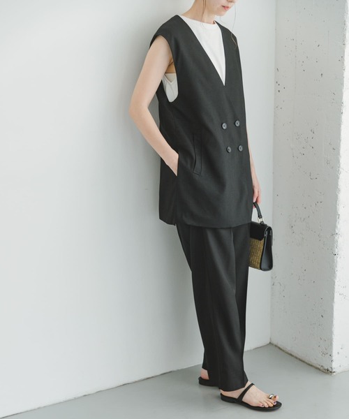 まるでリネンのようなナチュラルなルックスの生地で仕立てたジレ×パンツのセット。ジレはダブルボタンデザインでハンサムな印象がポイント。春はブラウスやTシャツをレイヤード、夏はキャミソールやタンクトップをインナーにしてノースリーブでといった着回しが効く1着。パンツはワイドデザインながらセンタープレスを加えた大人っぽいルックスがポイント。きちんと感がありながら、ウエストの後ろ身頃がゴム仕様なので見た目以上に楽な着心地を叶えました。 【2024 Spring/Summer】【24SS】 総重量 : 約570g ※商品画像は、光の当たり具合やパソコンなどの閲覧環境により、実際の色味と異なって見える場合がございます。予めご了承ください。 ※商品の色味の目安は、商品単体の画像をご参照ください。 ----------------------------- 《スタッフレビュー》 [スタッフA] 年齢 : 20代後半、身長 : 156cm、体型 : 普通 普段の着用サイズ : S,M 【着用カラー/サイズ】BLK / FREE 【サイズ感】ジレはお尻がしっかり隠れるくらいで、パンツはくるぶしが隠れるくらいの丈感です。どちらもオーバーサイズで楽ちんです。 【素材感/着心地】裏地はなく程良い厚みの生地感です。夏でも快適に着ていただけますし、長いシーズンで着用できます。 【その他】ジレのインナーはゆったりしたトップスでも余裕で羽織れるので、合わせやすいです。きちんと感もありつつ、ラフに着やすいデザインですので、様々なシーンでお使いいただけます。 ----------------------------- ▼お気に入り登録のおすすめ▼ お気に入り登録商品は、マイページにて現在の価格情報や在庫状況の確認が可能です。 お買い物リストの管理に是非ご利用下さい。 素材感 透け感 :なし 伸縮性 :なし 裏地 :あり(トップスのみ) 光沢 :なし ポケット :あり