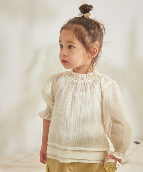 1枚でトレンドを取り入れられる透け感ブラウスが登場しました。 大人っぽいシアー感と贅沢なシャーリング使いが高見え。 総ゴム仕様なのでお子さまお一人でのお着替えも楽々です。 【スタイリング】 シンプルなボトムもシーズナルなシアーアイテムでトレンド感のあるコーデに大変身。 合わせるボトムス次第でイメージがガラッと変わります。 ロング丈のボトムやブルマはもちろん、サロペットのインナーとしてあわせていただくのもおすすめ。 上品な綺麗めアイテムなので、ちょっとしたお出かけにもぴったりです。 【ポケット】 なし 【伸縮性】 なし 【透け感】 透ける 【クリーニング】 洗濯機洗い可(ネット使用) 【裏地】 なし モニター・環境等により実際の商品と色味が多少異なって表示される場合がございます。 また、生産時期により色味が若干異なる場合がございます。予めご了承ください。