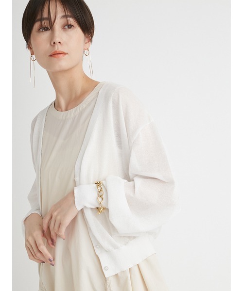 ■ハンドウォッシャブル透け感:有り伸縮性:有り光沢感:有り生地の厚さ:薄手■Designうっすらと肌が透けるシアー感と程よいラメ感が繊細なニットカーディガン。この時期の日よけや冷房対策にも活躍します。ボタンをしっかり止めて1枚着としてもおすすめですし、もちろんワンピースの上から羽織ったりと着回し力抜群です。ゆったりとした身幅で肌に付かなく涼しく着て頂けます。※照明の関係により、実際よりも色味が違って見える場合があります。またパソコン・スマートフォンなどの環境により、若干製品と画像のカラーが異なる場合もございます。予めご了承ください。商品の色味は、商品単品画像をご参照下さい。 ※商品画像はサンプルのため、色味やサイズ等の仕様に変更がある場合がございますので、予めご了承ください。