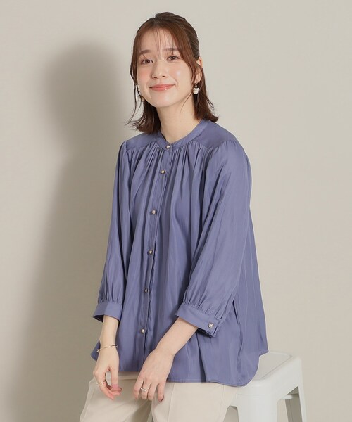 【デザイン】ON・OFF問わず幅広いシーンで活躍するサテンブラウス。ギャザーをよせた程よいゆるシルエットが、身体のラインを気にせず着やすいアイテム。リラックス感のある着心地ながらも、サテンのツヤ感とアクセントのゴールドボタンがきちんと感を演出。裾に向かって広がるAラインのシルエットがウエスト周りをさり気なくカバーし、パンツとの相性◎薄手の素材なのでボトムINしやすく、スカート合わせももちろんOK!【素材】柔らかな落ち感と上品なツヤ感が特徴のサテン素材です。※照明の関係により、実際よりも色味が違って見える場合があります。また、パソコン・スマートフォンなどの環境により、若干製品と画像のカラーが異なる場合もございます。モデル情報:身長166cm B80 W59 H85 着用サイズ:00(フリーサイズ)店舗へのお問い合わせ商品番号:P93-58514●製品寸法:00(フリーサイズ):着丈62cm B112cm 袖丈43cm 肩幅36cm備考: