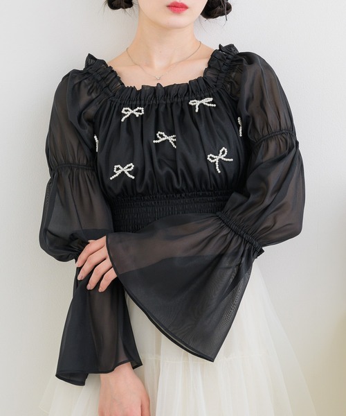<この春一番可愛いリボンデザインのブラウス>▼デザインこの春のイチオシアイテム!フロント部分に施されたパールで作られたリボンビジューが女の子らしい印象に。ウエスト部分はしっかり絞られていて、細見え間違いなし♪袖口はバルーンスリーブで広がったシルエットは、所作を綺麗に魅せてくれます。このブラウスと一緒に、新生活のヒロインになっちゃいましょう♪▼コーディネートマーメイドスカートやフレアスカートを合わせ、女の子らしさレベルアップしても可愛いです!デニム合わせしてカジュアルダウンさせても、オフショルダーで着用しても◎------------------------------生地感:薄手伸縮性:ある透け感:袖部分はある裏地:ある------------------------------▼ブランド紹介ems excite (エムズエキサイト)“more fun more cute”今をもっと楽しくもっと可愛くいたい女の子に向けたgirly cuteなブランド#パール#パールブラウス#シアーブラウス#シアー#ブラウス#ブラウスコーデ#ペプラム▼注意事項※撮影環境やモニター環境によって実際の商品とお色味が多少異なってみえる場合がございます。品番:EM456123B001 / 品名:リボンパールBL