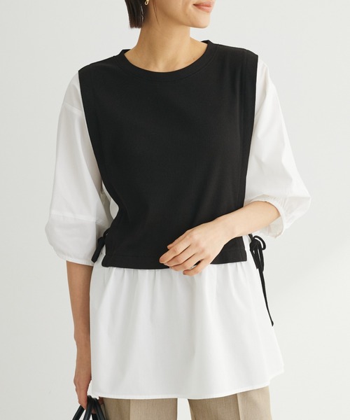 テレコ素材の異素材ドッキングで仕立てたチュニック。サイドで結ぶリボンや裾フレアなシルエットが可愛らしいポイント◎気になるボディラインも優しくカバーしてくれます。1着でもレイヤード風の着こなしを手軽に楽しむことができる嬉しいアイテムです。透け感[やや有り] 裏地[無し] 伸縮性[やや有り] 光沢感[無し] 生地の厚さ[薄手] 付属品[無し] ポケット[無し]●製品寸法:F:バスト55cm 着丈73cm 袖丈31.5cm 肩幅47cm 裾幅85cm備考: