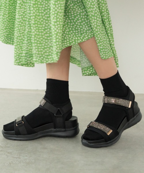 キラキラ輝くラインストーンをあしらい、スポーティーなのに女性らしく履けるストラップサンダル。 人気の厚底を取り入れ、さりげないゴールドパーツやスマートなシルエットなど、今っぽく鮮度のあるデザイン。 安定感抜群のボリュームソールが、自然なスタイルアップをアシスト。 なだらかな傾斜によるフラットな履き心地で、キレイ見えと軽快なフットワークを実現します。 また柔らかくクッションの効いた設計で、足への衝撃を軽減し、負担の少ない快適さ◎ つま先・甲の2か所で足をしっかりとホールドするベルト仕様で、着脱しやすく、自分サイズにフィット感の調節も自在です。 定番的なスポーツサンダルに上品なエッセンスを加え、高見えするスポーティエレガンスを体現。 ラクなのにラフになりすぎない、上質なカジュアルスタイルを演出します。 ●サイズ換算目安:S(22-22.5cm)・M(23-23.5cm)・L(24-24.5cm)・LL(25cm) ※展開サイズ:レディース ・素材:ナイロン/他 ・アウトソール:合成底 ・ヒールの高さ:約5.5cm ・重量(片足):約300g(Mサイズ) ・サイズ感:標準(個人差がございますので目安です)