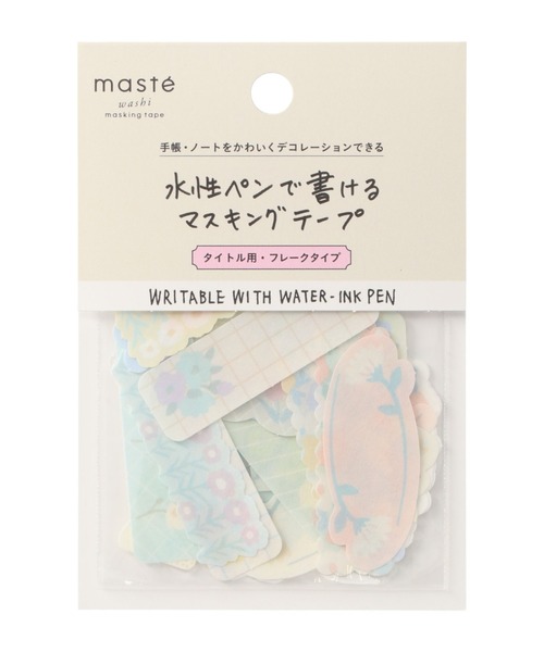 「マークスのログダイアリー」を手軽に楽しめるフレーク状マステ マステ®やシールで手軽にかわいく日々の“手帳デコ”を楽しめる、「マークスのログダイアリー」にもぴったりな「マステ® 水性ペンで書けるマスキングテープ」。 水性ペンで書ける機能はそのままに、ステッカーのようなフレークタイプのマスキングテープです。 淡い色使いのグラデーションやお花のモチーフ、シンプルなイラストタッチのデザインなど、全4種類がラインアップ。タイトル用として水性ペンで書きこめるだけでなく、ページの余白にはモチーフ柄をそのまま貼って手軽にかわいくデコできます。 自分好みのテイストやテーマにあわせてアレンジを楽しめるのもポイント。そのほかの人気の「マステ®水性ペンで書けるマスキングテープ」シリーズや「転写シール」とも相性抜群。貼るだけで簡単にページを彩れるので、「手帳デコは初心者」という方にもぴったりです。 ◎サイズ/H110xW75xD3mm ◎重さ/約8g ◎30枚入 【使用上のご注意】 *文具用途以外には使用しないでください。 *筆記には水性ペンをご使用ください。 *インクの流量が多いペンは、インクが乾くまでに時間がかかる場合があります。 *接着面の材質により、貼っていた部分が破損したり、のりが残ったり、粘着力が弱くはがれやすくなる場合があります。 *長期保管するものや、重要なものへのご使用はお控えください。 *感熱紙、ノーカーボン紙等にご使用の場合、文字が消えることがあります。 *高温多湿になる場所や直射日光のあたる場所でのご使用・保管はお避けください。 *お子様の手の届く所でのご使用・保管はお避けください。 「maste/マステ」は、株式会社マークスグループ・ホールディングスおよび、リンレイテープ株式会社の登録商標です。 ●商品についてのお問い合わせは、下記の品名・品番をお申し付けください。 品名:「マステ」手帳デコ マークス 水性ペンで書けるマスキングテープ・フレークタイプ・タイトル用 品番:MST-FA40