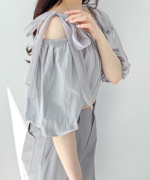 ーーー 【デザイン】 大ぶりリボンが着映えする主役級オフショルブラウス。 肩のリボンを柔らかなオーガンジー素材にすることで フェミニンムードの中に大人っぽさをプラスしています。 トレンド感たっぷりのバルーンスリーブもポイント。 華やかなボリューム感をだしつつ、 クロップド丈ですっきりと着用していただけます。 ーーー 【スタイリング】 コンパクトなミニボトムやデニム合わせのカジュアルコーデが おすすめです。 ※屋外の光や照明の当たり具合で、実際の商品と画像の色味に違いが発生する場合がございます。