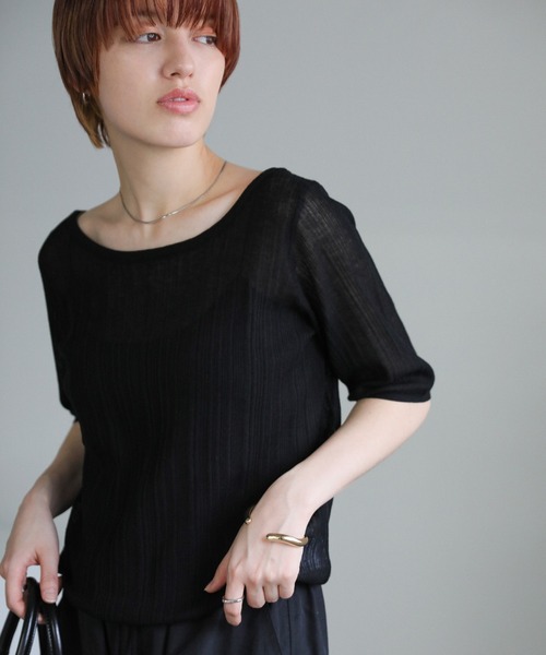 -point- & -styling-デコルテ魅せで上品な印象になるバレエネックのシアーニット登場。背中が広く開いたバックデザインでヘルシーに見せてくれます。更にシアー生地でより一層抜け感をプラス◎身体に程よくフィットしながら伸縮性もあるリブを使用しているため着心地も抜群です。ボトムスにボリュームのあるものやデザイン性のあるものを持ってくるとバランスがよく着用いただけます。バレエコアハーフスリーブニットソーバックオープン----------------------------素材 ポリエステル100%----------------------------伸縮性 ★★☆☆☆裏地 なし----------------------------※モニター・環境等により実際の商品と多少色味が異なって表示される場合がございます。 予めご了承をお願いいたします。=======================■袋梱包の為、染料による特有の匂いが抜けきれず、匂いがする場合がございますが不良品にはあたりません。 上記注意点での返品、交換はお断りします。ご了承の上お買い求めくださいませ。■本製品は生産過程におきまして色味、サイズ感等若干の誤差が出る場合がございます。予めご了承くださいませ。=======================【お買いものをお楽しみいただく為に!】▼商品のお気に入り登録完売カラーの再入荷通知や、ラスト1点の通知、セールの通知も受け取ることができます。▼ブランドのお気に入り登録新商品や再入荷など、いち早くブランドのお得な情報を受け取ることができます!