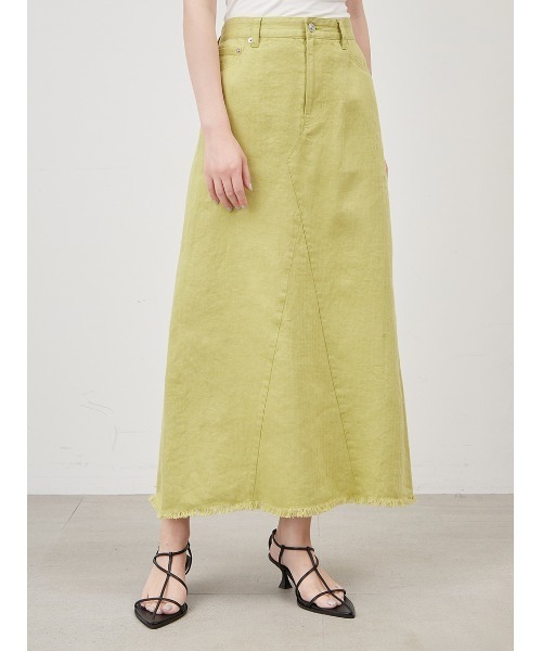 【リネン素材が映える軽やかなセミフレアシルエットのスカート】 【Design/Styling】 リネンならではの光沢と風合いが、こなれ感を誘うロングスカート。着ただけで様になるセミフレアシルエットが、大人の雰囲気を与えてくれます。台形シルエットは、体型カバーにも貢献。リメイク風のディテールや裾のフリンジ加工、ややローウエスト設定にすることで、今季らしく仕上げました。後ろスリットは、足さばきもスムーズです。ベルトを合わせて、ウエストマークのスタイリングもおすすめです。 【Fabric】 リネンとコットンをブレンドしているため、リネン100%よりもシャリ感が抑えられ柔らかな手触りです。 アイボリー、ライム、ブラックの3色展開です。 ※照明の関係により、実際よりも色味が違って見える場合があります。 またパソコン・スマートフォンなどの環境により、若干製品と画像のカラーが異なる場合もございます。予めご了承ください。 商品の色味は、商品単品画像をご参照下さい。 ※商品画像はサンプルのため、色味やサイズ等の仕様に変更がある場合がございますので、予めご了承ください。