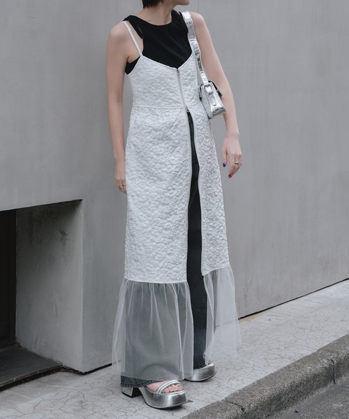 ー素材感ー軽やかで柄の凹凸感が表情豊かな華やかな素材感。中肉厚のジャガード素材なので、シワがつきにくいのも特徴です。裾にはトレンドのチュール素材を使用しております。ーデザインー胸下高めの位置で切替ラインを施すことで、ビスチェライクかつ脚を長くスタイリッシュな雰囲気に。センタージップの開閉で一枚着にも、レイヤードアイテムとしても着用いただけます。裾のチュール切替で足元の軽さや動きやすさも〇〈 RAY CASSIN / レイカズン 〉モードとストリートのファッションの中に感じる洗練さ。RAY CASSINは常に新しいものを求める方に向けたトレンドと自分らしさを表現できるブランドです。〈 information 〉▪︎ 商品のお気に入り登録商品の再入荷や、ラスト1点通知、プライスダウンしたセール情報など特別な通知を受け取ることができます。◾︎ ブランドのお気に入り登録新商品や再入荷、クーポン配布などお得なブランドの情報をいち早くお知らせいたします。