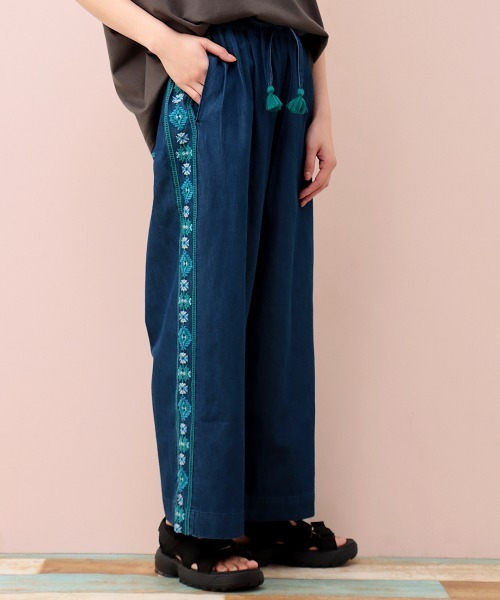 たっぷりと施したウィピール刺繍でクラスアップしたライトオンスデニムパンツ ■デザイン グアテマラの民族衣装ウィピールに織られる幾何学柄を両脇に贅沢に刺繍で表現した1枚。 風合いの良いライトオンスデニムを使い、ウエストゴムのワイドパンツにすることでデイリーに取り入れやすく仕上げました。 バックポケットにもたっぷり刺繍を入れて、後ろ姿も抜かりのないデザインです。 ■サイズ感 レディースフリーサイズ ウエストゴムで、締め付け感なく着用していただけます。 程よくゆったりとした、ストンとしたワイドシルエット。 ■素材感 柔らかく、しなやかなライトオンスデニム。 ■スタイリング ベーシックにTシャツと合わせるだけで、ワンランクアップした着こなしに。 華やかなデザインのアイテムとの相性も抜群! ■カラー ブルー/インディゴ ■お手入れ 洗濯機可/ドライクリーニング --------------------------------- 透け感:透けない 伸縮性:なし 裏地 :なし 光沢 :なし 生地の厚さ:薄手 ポケット:あり --------------------------------- -こだわりの詰まったプレミアムコレクション- 伝統技術や刺繍などを贅沢に施した、一味違ったプレミアムな商品をお楽しみいただけます。 【お取り扱い上のご注意】 ・この製品はインディコ染料を使用しております。 着用中の摩擦により色移りする場合がありますので淡い色の衣気やバックと一緒に使用しないで下さい。 ・水洗いする際には色落ちする場合かありますので他のものとは別にして洗って下さい。 濡れた状態で放置したり、他の物と重ねたりしないで下さい。 ・回転式乾燥機(クンプラー)は型崩れや収縮の恐れがあるためご使用はお避け下さい。 ・蛍光剤、漂白剤入りの洗剤は淡色の色を変化させる恐れがありますのでご使用はお避け下さい。 洗い加工を施し独特の風合いを表現している為製品により多少色にはらつきがあります。 お洗濯の際には、洗濯ネットを使用して下さい。 アイロンの際には、当て布を使用して下さい。 【TITICACAのお買いものをお楽しみいただくために!】 ▼商品のお気に入り登録 完売カラーの再入荷通知や、ラスト1点の通知、セールの通知も受け取ることができます。 ▼ブランドのお気に入り登録 新商品や再入荷など、いち早くブランドのお得な情報を受けることができます!