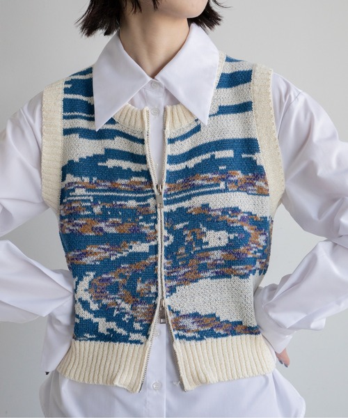 - 2024 VACANCY SUMMER COLLECTION -何の柄だと思う?と聞きたくなるオリジナル柄がお洒落なニットベスト。◆FABRIC表面感のある糸を使用し、柔らかくシャリ感のある爽やかな触り心地のニットベスト。上下開くダブルZIPが便利でスタイルによってバランスを調整できるのも嬉しいポイント。柄は街の風景をイメージしてデザイン。カラーによって街の風景が変わり。ブルーは、日中の風景アイボリーは、夕日の風景と印象を変えられる楽しめるデザインです。ZIPニットベストは、ジレにもトップスとしてもシーズンレスに着こなせる重宝なアイテムなのも嬉しいです◎◆STYLEレイヤードをしてTシャツやシャツ合わせはもちろん、キャミと合わせて1枚着のようなトップスとしてもオススメです。インナーのアイテムによってスタイリングの雰囲気が変わるのでシンプルコーデのアクセントにも。・・・・・・・・・・・・・・・・・・・・透け感:なし裏地:なし伸縮性:あり光沢感:なし生地の厚さ:普通・・・・・・・・・・・・・・・・・・・・【お買い物をお楽しみいただく為に】▼お気に入り登録をオススメ致します▼♡をクリックして下さい。・《商品のお気に入り登録》で再入荷通知や、ラスト1点の通知、セールの際の通知も受け取ることができます。・《ブランドのお気に入り登録》で新作商品や再入荷など、お得な情報を受け取ることができます!【ATTENTION】 ※画像の商品はサンプルです。実際の商品と色味、仕様、加工、サイズ、素材等が若干異なる場合がございます。※撮影場所やお使いのモニター環境により若干お色味が異なる場合がございます。※製品によっては染料の特性上、湿った状態や汗をかいた状態での長時間の放置、または摩擦により、他のものへ色移りする恐れがありますので、着用時にはご注意下さい。 ※お洗濯については商品の洗濯タグ表記をご確認ください。※風通しがよく、湿気の少ない日の当たらない場所で保管して下さい。 ※また製品加工上、お手元に届く際に匂いが生じる場合がありますが、 ご使用を続けていく事により匂いは軽減されます。