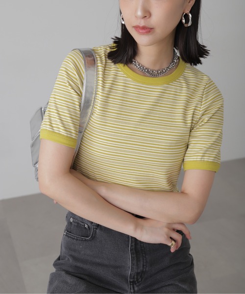 [Fabric&Design] ランダムの単色使いのボーダーリブカットソー。 首元にボーダー同カラーのパイピングを取り入れました。 柄は細めのボーダーにする事でカジュアルな印象が強すぎず合わせやすいです。 袖は少し長めの半袖になっているため、二の腕周りもしっかりカバー。 ピタッとしすぎない程よいフィット感。 [Styling] シンプルにデニムパンツやカーゴパンツなどカジュアルなパンツと合わせるのがおすすめ。 コンパクトなサイズ感でキャミワンピースやサロペットのインナーとしても◎ ■透け感:なし ■生地の厚さ:普通 ■裏地:なし ■伸縮性:あり ■光沢:なし ■シルエット:スタンダード model:骨格ウェーブ --------------------------------------------------- ◆商品のお気に入り登録◆ お気に入りアイテムの値下げ・再入荷・在庫1点などの通知を受け取ることができます。 ◆ブランドのお気に入り登録◆ 新商品や再入荷、セール、クーポン配布などお得な情報を受け取ることができます。 --------------------------------------------------- ※ご注文いただいた予約商品のお届け時期の確認は、注文履歴ページより行えます。