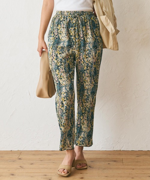 ミックスモザイク柄がコーデの主役になる程よいゆったり感の大人リラクシー楊柳パンツ■デザイン・シルエット裾に向かって細くなるテーパードシルエットで足を綺麗に見せてくれます。ラインを拾いすぎないシルエットにウエストゴム&ウエスト紐仕様でサイズ調節もできるので、ゆるっとノンストレスに着こなせます。■生地・細かいプリーツが入ったしぼ感のある楊柳生地・非常に軽い着心地で動きやすい・伸縮性に優れ、さらりとした優しい手触り■コーディネートシンプルなコンパクトTやボトムスインした着こなし方で、女性らしさの残るコーディネートに仕上がります。スニーカーやサンダルと合わせたカジュアルコーデはもちろん、ローファーと合わせた大人カジュアルコーデもおすすめです。伸縮性:あり透け感:なし裏地:なしポケット:あり生地感:しわ感のあるさらりとした生地注意点:デリケートな素材のため、負荷がかかると縫い目の滑脱等が生じる恐れがあります。お洗濯方法によっては縮みや色あせの可能性あり。乾燥機等のご使用はお控え下さい。▼生地や素材の性質により2cm前後サイズ誤差が出る場合がございます。▼モデル着用写真は撮影環境により、多少実際のカラーと異なる場合がございます。▼色落ちの恐れがありますので、他のものと分けて洗って下さい。▼当商品は機械による生産の過程上、『生地を織る際の糸の継ぎ目』や多少の『ほつれ』、繊維の『混紡』、形やサイズに多少の『誤差』が生じる場合がございます。