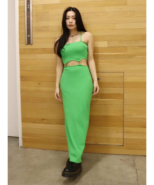 ■デザイン ウエストにチェーンをあしらったデザインがポイントのロングワンピース。 リブ素材で伸縮性があり、体にしっかりフィットする着心地です。 夏らしい、ヘルシーは肌見せが楽しめる一枚です。 バックスタイルはクロスになっており、ちょっぴりセクシーに。 ■スタイリング スニーカー合わせでカジュアルさをプラスするのがおすすめです。 -------------- 透け感:なし 裏地:なし 生地の厚み:普通 伸縮性:あり --------------