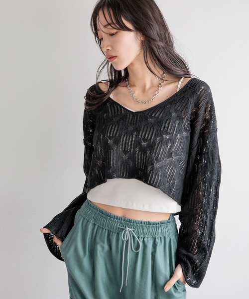 ■素材■ ドライタッチのアクリル糸を使用したサラッとした着心地のスカシ柄ニット。 立体感のある柄にすることで1枚でも着映えするアイテムになっています。 ■デザイン■ トレンドの透かし編みと大きめの袖口が女の子らしいニットプルオーバー。 デコルテが綺麗に見える首回りとショート丈でスタイルアップ効果があるデザインに。 前後2wayで着用いただけるのでその日のスタイリングに合わせて着こなし方を変化させて着用いただけます。 ■スタイリング■ ショート丈のアイテムなのでハイウエストボトムスとのスタイリングがオススメです。 キャミワンピースの上にさらりとレイヤードしても相性良く着用いただけます。