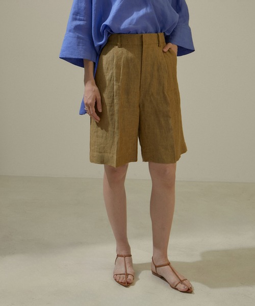 ヨーロッパの上質なフラックスリネンを使用した夏にぴったりな清涼感のある大人のハーフパンツ■デザイン/シルエット ヨーロピアンフラックスリネンを使用した上品なハーフパンツ/ショートパンツです。 センタータック入りで美脚効果もあり、程よいゆとりあるシルエットが大人の抜け感ある印象に。 短すぎないハーフ丈にしているので子供っぽくならず、落ち着いた印象に映ります。 程よい光沢感と張り感、綺麗で高級感のある生地がシャープなムードのアイテムです。 きれいめにもカジュアルにも使えるデザインと軽い着心地なので、デイリーにも使いやすい1枚。 裏地なしですが透けも気にならず、夏場でも涼しく着用頂けます。 シックなブラックと夏にぴったりなベージュ系の2色展開です。 ■素材 ヨーロッパで栽培されるフラックスという植物を使用して生産されたリネンを使用。 多種な麻のなかでもプレミアムな肌触りと仕上がりのフラックスリネン。 従来の麻のイメージにあるようチクチク感がなく、上品な艶感とナチュラルな表面感、美しい発色が特徴です。 ご自宅でお洗濯可能/マシンウォッシャブルなのも嬉しいポイント。 ■コーディネート Tシャツと合わせたアクティブなスタイルでもきれいめにアップデートしてくれる上品な一枚です。 オーバーサイズのシャツやブラウス、チュニック等と合わせたり ジャケットを羽織ってマニッシュに仕上げても◎ ■モデル身長:172cm 着用サイズ:M(ロングヘアモデル) ■モデル身長:166cm 着用サイズ:M(ショートヘアモデル) ■モデル身長:164cm 着用サイズ:M(ミディアムヘアモデル) ----------------------------- 裏地:なし(ウエスト部分のみあり) 光沢感:なし 透け感:なし ウエスト:ゴムなし ポケット:あり 伸縮性:なし 生地の厚さ:やや薄手 -----------------------------