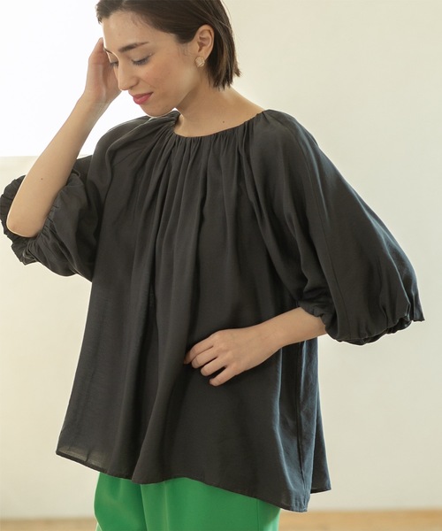 バルーンスリーブが華やかさ溢れるトレンド感たっぷりのブラウス。【デザイン】・ギャザーのふんわりとした自然な立体感が素敵なバルーンデザインのブラウスです。・五分袖丈で重い印象にならない絶妙なボリューム感のバルーンスリーブがポイント。・裾がAラインに広がった後ろ丈が少し長くなっているシルエットなので、ボトムにインでもアウトでもサマになるデザインです。・首元もギャザーたっぷりのフェミニンさがあり、後ろネックラインはスリット開きの一つ釦。・デニムと合わせたカジュアルスタイルも、スカートを合わせてドレスアップスタイルにも着回せるアイテムです。【素材】・微光沢なほんのりシアーの質感と軽さのあるレーヨン/ナイロン素材を使用。・ご家庭での手洗いが可能です。モデル情報:身長166cm B72 W57 H84 着用サイズ:38(M)店舗へのお問い合わせ商品番号:637-88043●製品寸法:38(M):着丈65cm B140cm 裄丈56cm40(L):着丈67cm B143cm 裄丈57cm42(LL):着丈67cm B146cm 裄丈58cm備考: