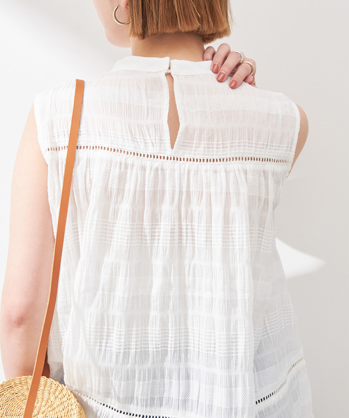 【2024SS】B.C STOCK夏にぴったりのスリーブレスブラウス。ふっくらとした凹凸感が魅力のシュリンク加工の生地に、切り替え部分にハシゴレースを挟み軽さをだしています。ポコポコとした表面感が可愛らしく、ギャザーをふんだんに寄せたAラインシルエットで体型もカバーでき、風通しも良いので夏にピッタリのブラウスです。手洗い可能でご自宅でのイージーケアができるのも嬉しいポイントです!**********************透け感:ややあり裏地:なし伸縮性:ややあり光沢感:なし生地の厚さ:普通**********************【スタッフ着用コメント】 《スタッフ staff.s》 身長:165cm/普段サイズ:M/着用サイズ:フリーサイズ感:身幅にゆとりがあり、幅広い体型の方にお楽しみ頂けます。素材感:春夏にぴったりなナチュラルな素材感です。着心地:リラックス感のある着心地で、デイリー使いに最適です。※あくまで個人の感想です。 **********************※取り扱いについては、商品についている品質表示でご確認ください。※ブラック(001)カラーについて・着用中の摩擦や、汗、水濡れにご注意ください。濡れたままの状態で擦れると、色移りすることがあります。※こちらの商品は、B.C STOCKでの取り扱いになります。 直接店舗へお問い合わせの際はB.C STOCK店舗へお願い致します。※照明の関係により、実際よりも色味が違って見える場合があります。またパソコン・スマートフォンなどの環境により、若干製品と画像のカラーが異なる場合もございます。※商品の色味は、商品アップ画像をご参照ください。ブラック着用スタッフ:157cm 着用サイズ:フリーホワイト着用スタッフ:163cm 着用サイズ:フリー詳細着用スタッフ:162cm 着用サイズ:フリー本体:手洗い可能