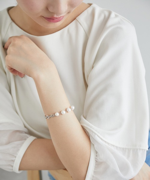 淡水パール×チェーンブレスレット。ゴールドとシルバーの2色展開。※撮影時の光、お使いのモニター環境によって色の見え方が違う場合がございます。