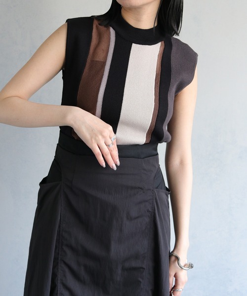 毎年大人気の配色ニットにノースリーブが新登場! 【Point/Styling】 シックなカラーリングが大人な印象に仕上げます。 ベーシックなアイテムながら、メリハリをつけるポイントカラーや一部にシアーを組み合わせて個性を演出。 洗練された抜け感がり、さりげない肌見せをお楽しみいただける一枚。 ワイドパンツやデニムと合わせた大人カジュアルスタイルや、タイトスカートと合わせたきれいめスタイルがおすすめ。 上にジャケットなどのライトアウターを羽織っていただいても様になります。 ---------------------------------------------------- 【Detail】 ・綿混糸のを使用したミラノリブとリブ編みの切替 ・色使いと編地のコントラストがこなれ感を演出 ・一枚でも様になり、インナーとしてもお使いいただきやすいほどよいフィット感 透け感/一部あり 光沢感/なし 伸縮性/あり 厚 み/ふつう ---------------------------------------------------- ※撮影場所により、実際の色味と若干異なる場合がございます。 またパソコン・スマートフォンなどの環境により、若干製品と画像のカラーが異なる場合もございます。予めご了承ください。 ※商品画像はサンプルのため、色味やサイズ等の仕様に変更がある場合がございますので、予めご了承ください。 ---------------------------------------------------- 【お買い物を楽しんで頂く為に】 ■商品のお気に入り登録 お気に入りの登録をして頂きますと 完売カラーの再入荷通知や、ラスト1点の通知を受け取ることができます。 ■ブランドのお気に入り登録 新商品の発売や再入荷、タイムセールやクーポン発行のお知らせなど &g'aimeがお届けするお得な情報を受け取ることができます。