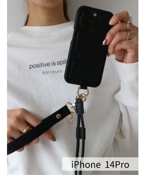 ※iPhone14Pro対応 【Item Comment】 大人気のオリジナルiPhoneケースから新作が登場。 高級感のあるフラットなエコレザーを使用し、 さりげない型押しロゴと GOLDで統一した金具で大人な雰囲気に仕上げました。 デイリーに使うものなので機能性や利便性にも拘り、 重さは約73gの超軽量。(本体:約35g) 2つ取り付けたストラップは取り外し可能なので、 気分やシーンに応じてお使いいただけます。 長さ調節可能なショルダーストラップは、 肩から掛けることで紛失してしまうリスクが軽減され バッグから取り出す手間もなくなるので、 さっと写真を撮ったりできるのも便利なポイント。 ロゴ入りのハンドストラップは、 手首に掛けて使用すればスマホを落としにくくなり デザインのアクセントにもなっています。 背面にはカードポケット付きで クレジットカードや、交通IC系カードなどを収納できます。 ケース本体に取り付けたリング部分には、 付属のストラップ以外にも お持ちのキーホルダー等をつけていただくことで 更に使いやすく、オリジナリティのあるiPhoneケースが楽しめます。 全体的に華奢で女性らしいデザインなので、 アクセサリー感覚でコーディネートにプラスできる TRUNC 88の拘りがつまったアイテムです。 【Color Variation】 BLACK/GREGE ※着用画像は実際の商品とお色味が多少異なる場合がございます。 【Model】 Director(佐野真依子):162cm 【 “お気に入り登録”でお買いものが便利に! 】▼商品のお気に入り登録完売カラーの再入荷時や、ラスト1点の時、セール開始時にお知らせします。 ▼ブランドのお気に入り登録新商品や再入荷、セール情報など、 いち早くTRUNC88のお得な情報を受け取ることができます。ぜひご活用ください。