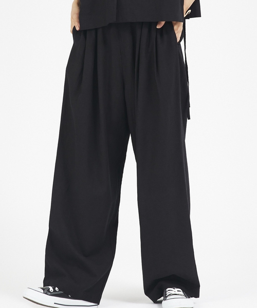 毎年人気の夏の定番シリーズ【Design】清涼感があるリネン混のワイドパンツ。タックのように立体感を持たせたウエストゴム使用でこれからの季節に嬉しいリラックス感のある履き心地です。柔らかく動きのある素材感は程よい女性らしさも演出します。【Fabric】夏の定番人気、レーヨンリネン素材使用。リネン混でもシワになりにくく、カジュアル見えしすぎない生地感です。ご自宅で手洗いOK。【Styling】リラックス感が出過ぎないように女性らしい旬なシアートップスなど合わせるのもおすすめ。同素材のシャツとセットアップも楽しめるシリーズ展開です。