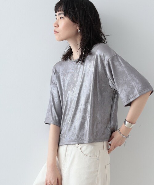 Design Pointピカピカ輝く素材感がスタイリングを華やかにしてくれる今年らしいクロップドTシャツ。ゆるっとしたほどよく身離れしたシルエットのシンプルなデザインです。Styling Pointどんなアイテムにも対応可能なマルチトップス。ジャケットのインナーにさらっと着るだけでモード感をプラスしてくれます。一枚持っていると便利な一枚! Fabric Point体の動きに柔軟な伸縮性のよいカットソー地を使用。店舗へのお問い合わせ商品番号:523-18019●製品寸法:38(M):着丈52cm B104cm 袖丈24cm 肩幅50cm備考: