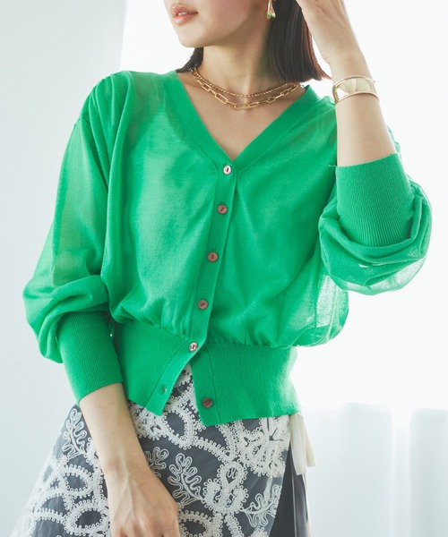 シアー素材が涼しげな印象を与える万能カーディガン◆2024春夏◆【デザイン・シルエット】 Vネックラインがデコルテラインを綺麗に見え、身体のラインを広いづらいサイズ感。 <POINT>・シアー素材が涼しげな印象を与える万能カーディガン。・キャミソールなどの羽織や夏の冷房対策にも気軽に使えてうれしいアイテム。・裾、袖口のリブでメリハリあるシルエットで釦をすべて閉めてトップス使いもおすすめ。 【素材】 柔らかくドライタッチで、肌にあたってもストレスなく着用できます。 【カラー】 ブラック、ホワイト、ブラウン、グリーンでベーシックからカジュアルなスタイルにも合わせやすいの4色展開 【おすすめのスタイリング】 ロング丈のワンピースの羽織としてもバランスが取りやすい!ボタンを閉めてプルオーバーデザインでシアー感を楽しんでいただけます。 ----------------------------- 裏地:なし 光沢感:なし 透け感:あり 伸縮性:あり ボタン:あり(開閉可) 生地の厚さ:やや薄手 季節:春、夏、初秋 ----------------------------- 【モデル着用サイズ】メインモデル身長:163cm、着用サイズ:F詳細モデル身長:160cm、着用サイズ:F ※画像の商品はサンプルです。 実際の商品と仕様、加工、サイズが若干異なる場合がございます。 ※重量はサンプルMサイズの測量になります。サイズによって多少異なる場合があります。 ※画像によっては実際の色味と異なる場合があります。正しい色味は生地アップ画像をご確認ください。
