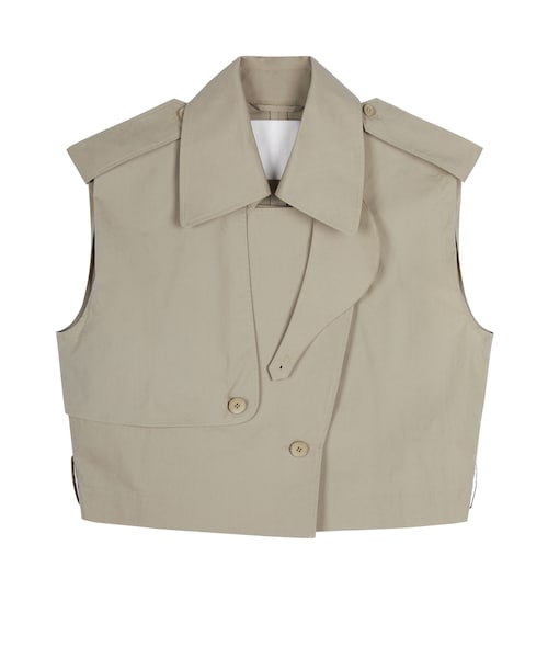 【手洗い可能】クラシックなディテールが目を惹くベストです。ハリのある薄手の綿素材を使用しており、春から夏までロングシーズン着こなせるのも魅力です。ショート丈なので、ウエスト位置を高く見せることができ、スタイルアップ効果を狙えます。JN79 5O4511790 ベスト #ショートトレンチ#ブラック#ベージュ