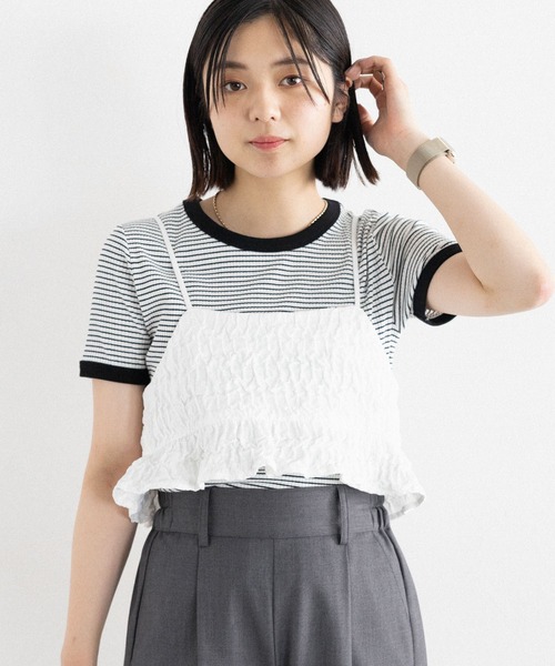 レイヤードスタイルの定番『ビスチェ』 フリル×リボンで程よく甘い、トレンドライクな雰囲気に◎ ■ポイント ・バックのダブルリボンデザインが大人可愛いキャミビスチェ ・短丈に仕上げ、スタイルアップ効果も◎ ・ぽこぽことした表面感の可愛い、フクレジャガード素材を使用 ・肩紐で長さ調節可能なので、幅広い体形の方にフィット! ・合わせるアイテム次第で、オールシーズン着回せる万能アイテム◎ ・シンプルコーデにプラスするだけで、一気にトレンドスタイルに! ・フリル×Wリボンで、程よく甘い雰囲気に仕上がりました◎ ■素材 柔らかく、触り心地の良いコットン100%。 フクレジャガード素材でこなれ感漂う一着に! ーーー ■スタイリング 普段のスタイルにプラスするだけで、トレンドライクな雰囲気に◎ 春の時期は、ジャケットやシャツとのレイヤードがお洒落見え! 夏にかけてTシャツやシアートップスなど、幅広いアイテムと相性抜群。 カジュアル、スポーツ、キレイ目等、好みの雰囲気でお楽しみいただけます!