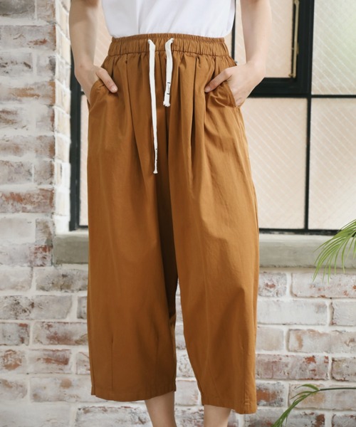 ゴム入りで、ウエスト調節できるカジュアルなワイドパンツです。 通気性に優れ、ゆったりとした快適な着心地になっています。