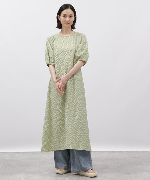 凹凸のある素材が特徴のワンピース。無地でも表情があり、ボリュームのあるランタンスリーブはシンプルなデザインのアクセントにも。身幅にゆとりもあり裾に向かってフレアに広がるデザインは締め付けもなくリラックス感のある着心地の1枚です。【スタイリング】ワンピースとしてはもちろん、ボトム合わせのスタイリングもおすすめです。