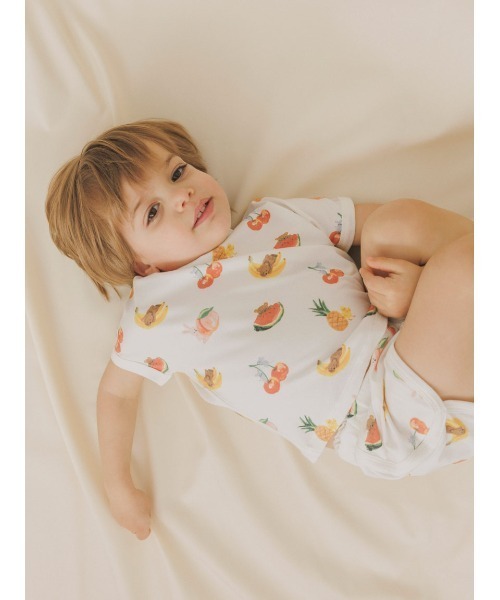 こちらの商品は衛生上の観点から返品・交換不可となります。【夏気分を盛り上げるフルーツアニマル柄のBABYフレンチスリーブT】【Fabric】コットン混の柔らかいカットソーを使用しました。肌に触れるとひんやりとした触感が得られる接触冷感素材を使用しています。快適な着心地をお楽しみいただけます。【Design/Styling】夏のフルーツと遊ぶキュートな動物たちを柔らかいカットソーにプリントした、親子で楽しめるフルーツアニマルシリーズです。カラフルな絵柄が目を引くBABYサイズのTシャツは、アームホールに切り替えがないデザインです。同シリーズのショートパンツやBABY小物、同時期に展開するスムーズィー3ボーダーシリーズとのコーディネートもおすすめです。同柄のLADIES、KIDSアイテムやママ小物シリーズも揃えているので、親子でリンクコーディネートをお楽しみいただけます。【Size Chart】50…0~3ヵ月 (ねんね期)70…6ヵ月~ (首すわり期)80…12ヵ月~ (ハイハイ・たっち期)※参考年齢は目安となります。個人差がございますのでご注意ください。※照明の関係により、実際よりも色味が違って見える場合があります。またパソコン・スマートフォンなどの環境により、若干製品と画像のカラーが異なる場合もございます。予めご了承ください。商品の色味は、商品単品画像をご参照下さい。 ※商品画像はサンプルのため、色味やサイズ等の仕様に変更がある場合がございますので、予めご了承ください。